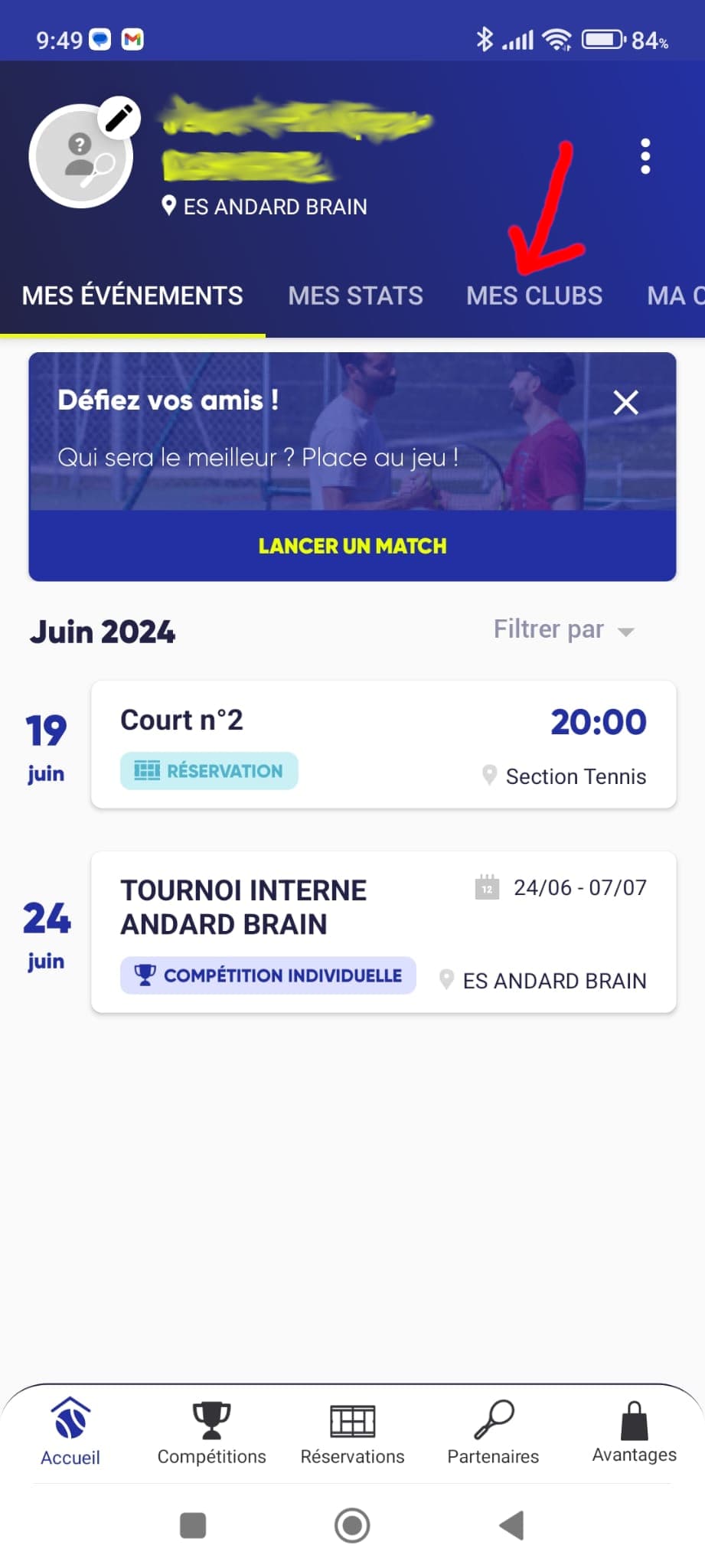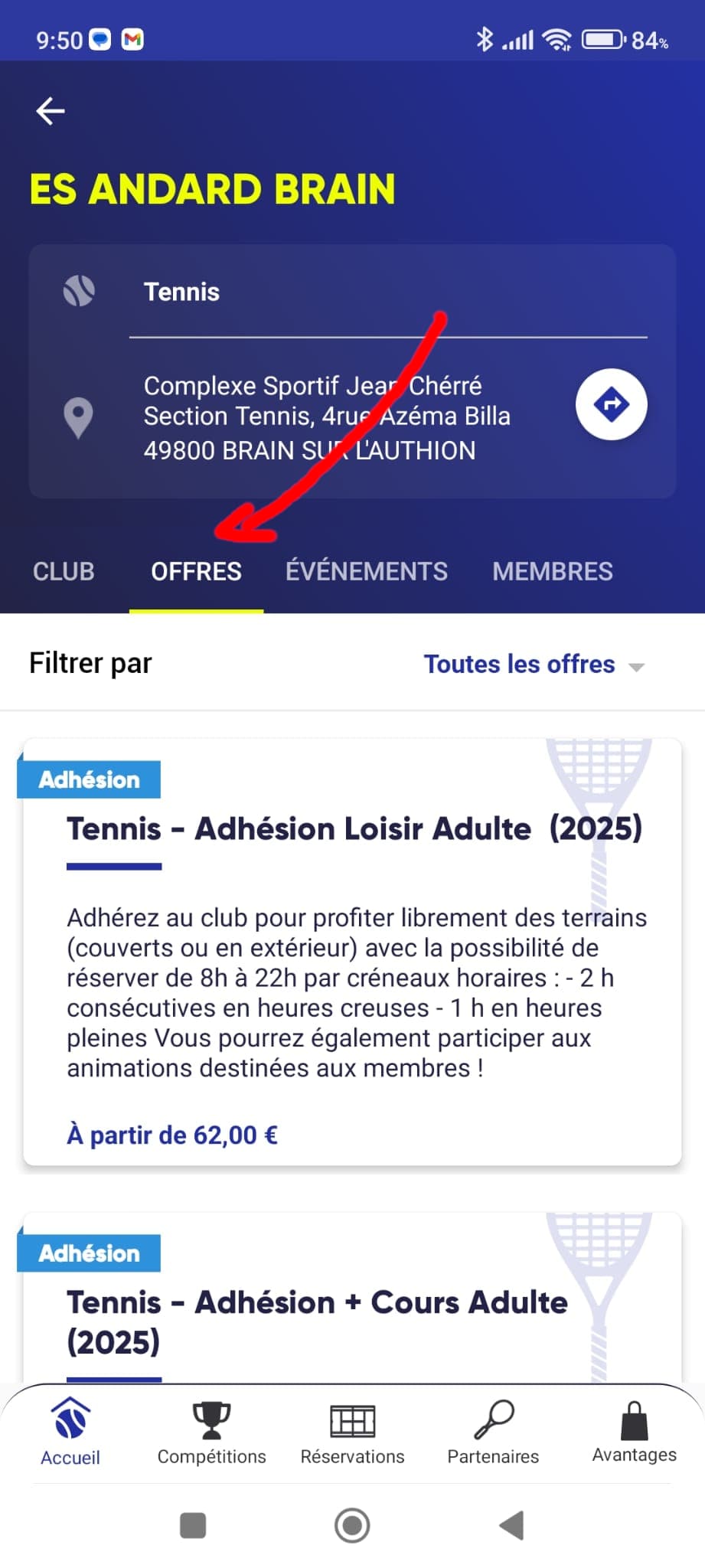 - sur le téléphone et l'application TEN'UP, sur la page d'accueil, activez l'onglet MES CLUBS, cliquez sur ES ANDARD BRAIN puis l'onglet OFFRES.