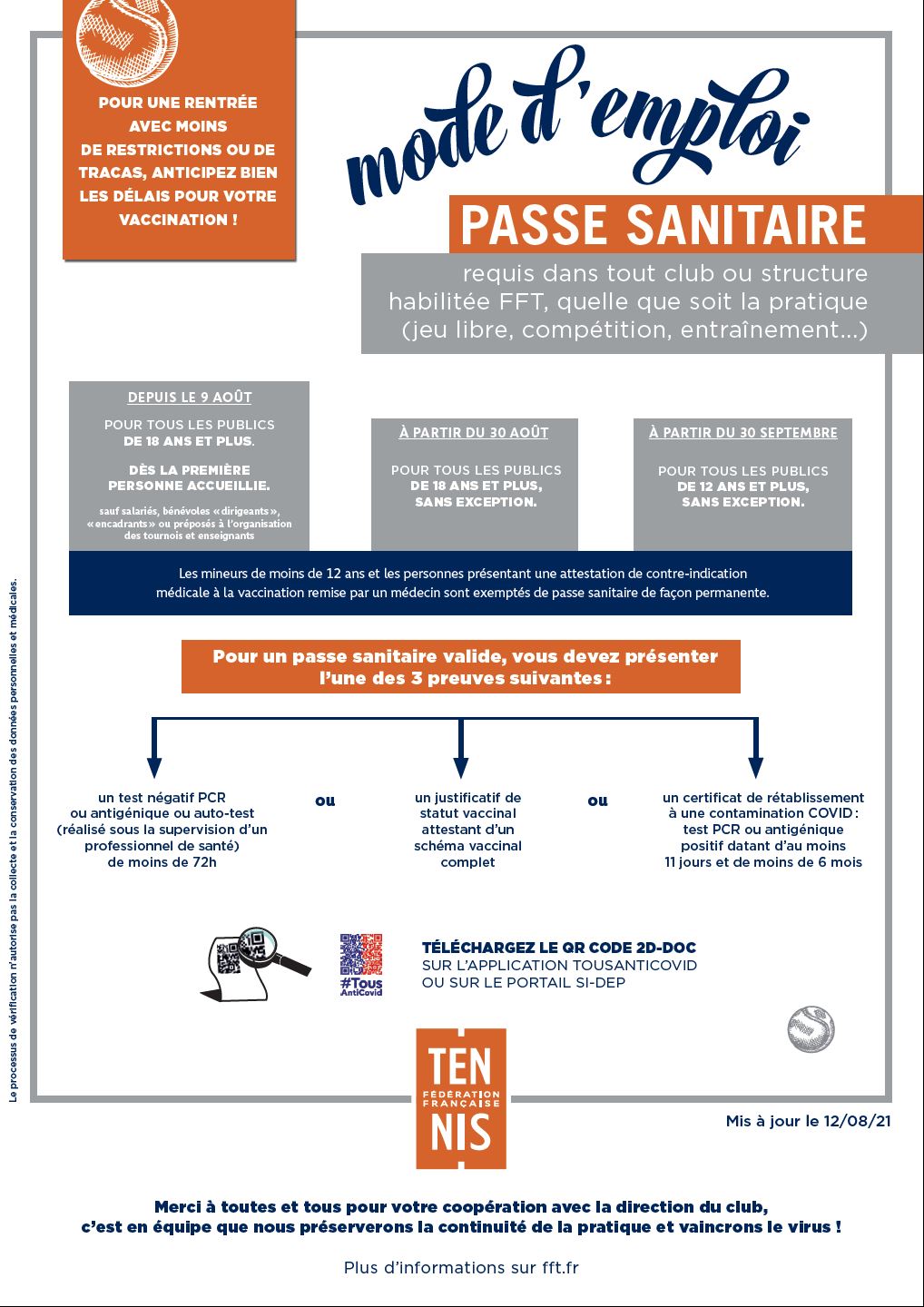 Les adhérents, personnes de passage (adversaires, invités, etc...) de plus de 18 ans doivent posséder le Pass sanitaire pour réserver et jouer sur les terrains.