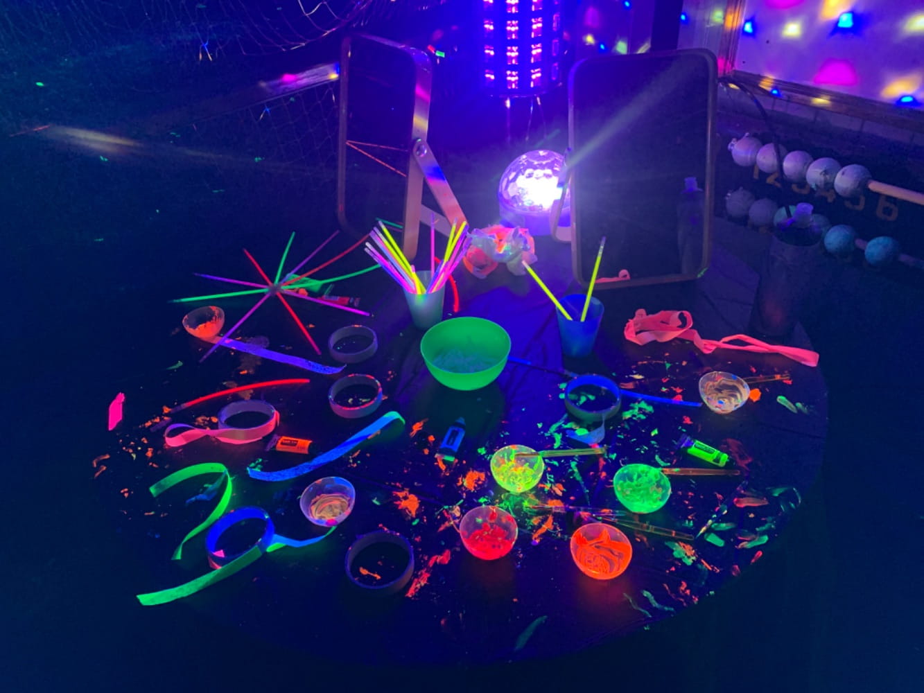 Les raquettes décorées de bandes fluos et les participants grimés de maquillage et même certains déguisés.